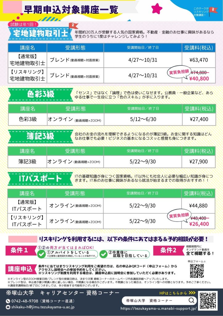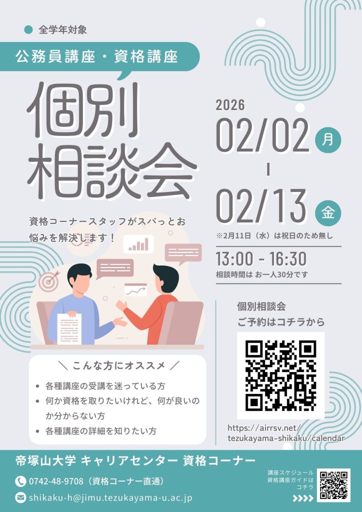 場所: 学内 資格コーナー窓口 または オンライン(参加URLは予約後、お送りします。)